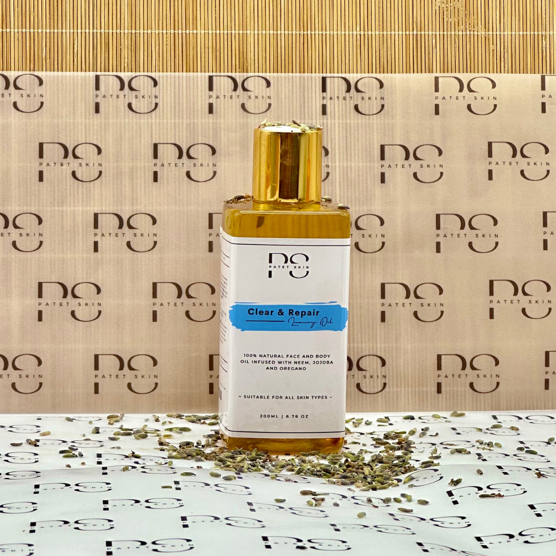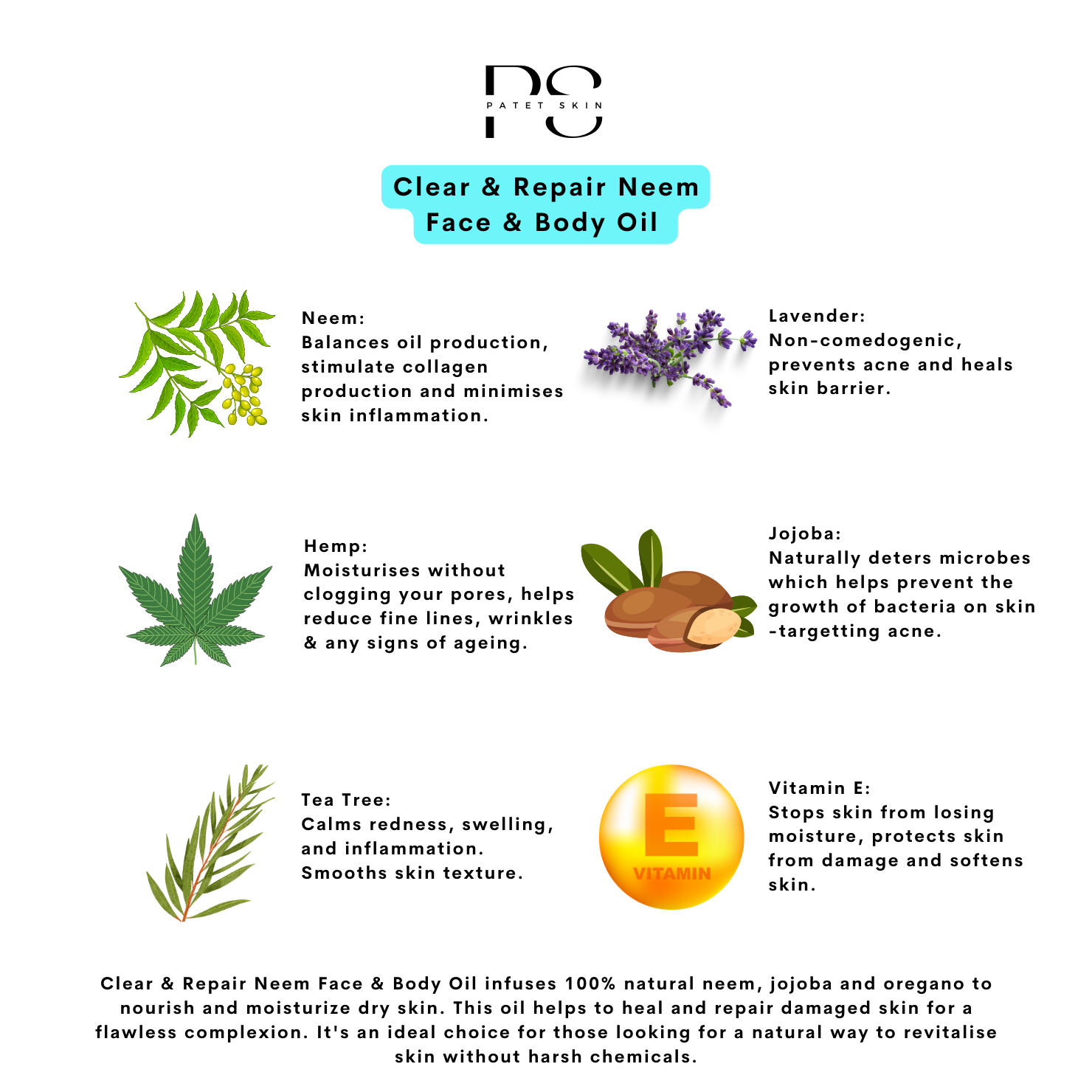 Clear & Repair Neem Face & Body Oil infuses 100% natural neem, jojoba and oregano to nourish and moisturize dry skin. This oil helps to heal and repair damaged skin for a flawless complexion. It's an ideal choice for those looking for a natural way to revitalise skin without harsh chemicals.