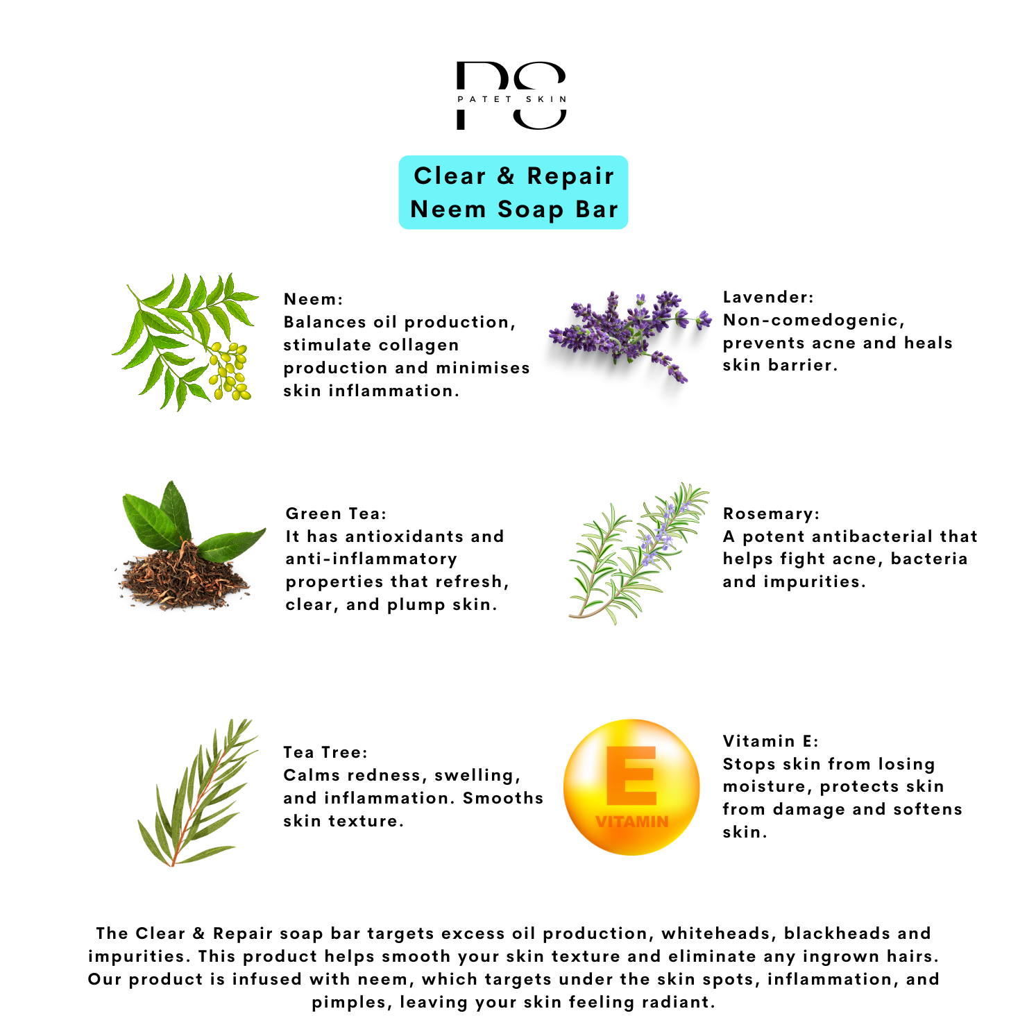- The Clear & Repair soap bar targets excess oil production, whiteheads, blackheads, and impurities. This product helps smooth your skin texture and eliminate any ingrown hairs. Our product is infused with Neem, which targets under the skin spots, inflammation, and pimples, leaving your skin looking and feeling clear.